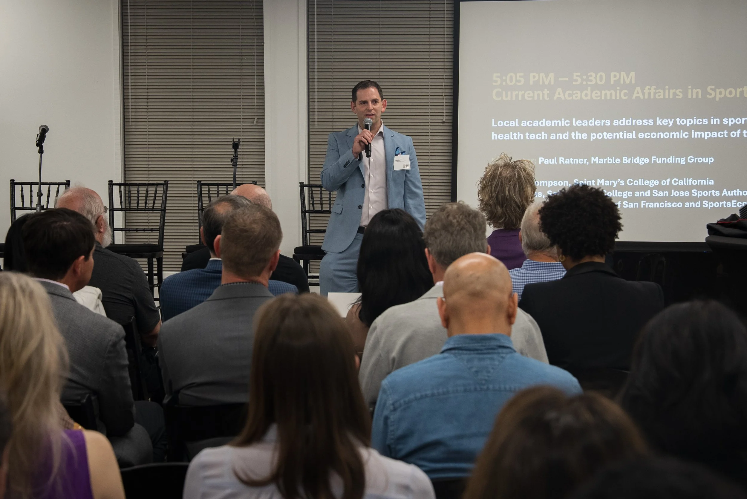 The first panel, Current Academic Affairs in Sports & Health Tech, was moderated by Paul Ratner and included Roger Thompson, President, Saint Mary’s College of California; Charlie Faas, Senior Vice President, Saint Mary’s College of California, and a member of San Jose Sports Council; and Dan Rascher, Professor, Sport Management Master’s Program at University of San Francisco, and president of SportsEconomics LLC.