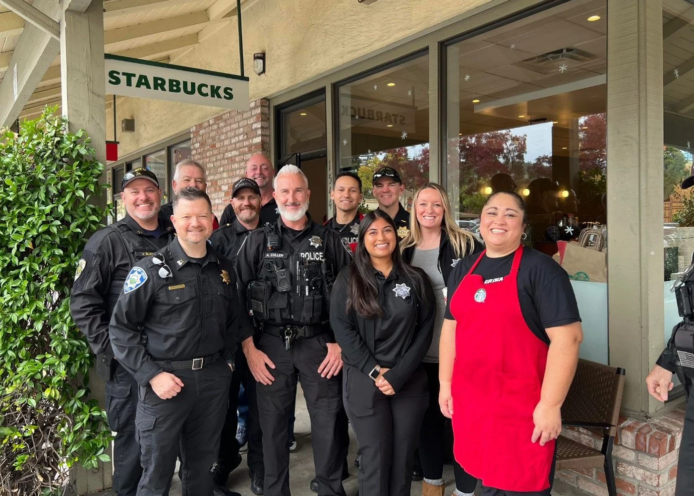 Walnut Creek Police Chief Ryan Hibbs (front row, left), Crime Prevention Specialist Kira Raman (front row, third from left), and WCPD sworn personnel meet with local store managers and employees at their places of business to build relationships and open lines of communication. [Photo Walnut Creek Police Department]